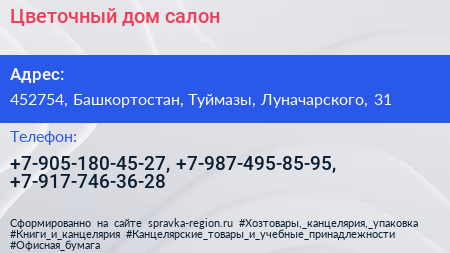 Цветочный дом, салон по адресу 452754, Башкортостан, Туймазы, Луначарского, 31 в дальнейшем Организация, размещена в следующих категориях:
