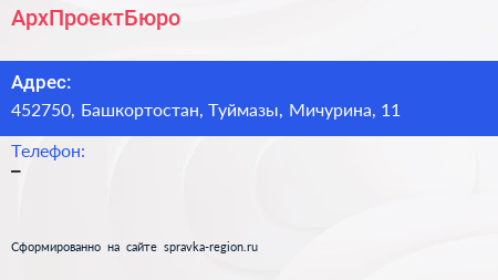 АрхПроектБюро по адресу 452750, Башкортостан, Туймазы, Мичурина, 11 в дальнейшем Организация, размещена в следующих категориях:
