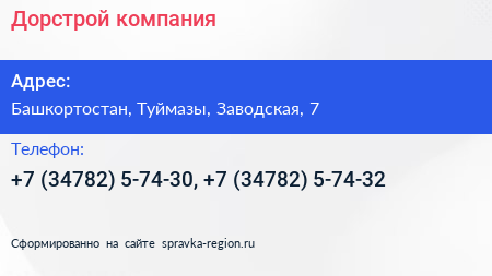 Дорстрой, компания по адресу Башкортостан, Туймазы, Заводская, 7 в дальнейшем Организация, размещена в следующих категориях: