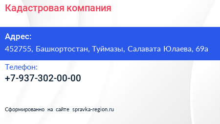 Кадастровая компания по адресу 452755, Башкортостан, Туймазы, Салавата Юлаева, 69а в дальнейшем Организация, размещена в следующих категориях: