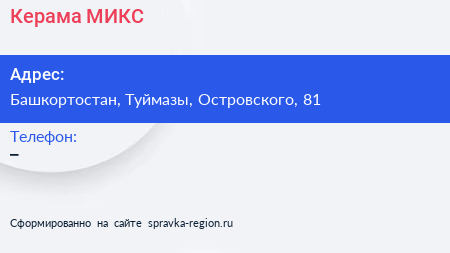 Керама МИКС по адресу Башкортостан, Туймазы, Островского, 81 в дальнейшем Организация, размещена в следующих категориях: