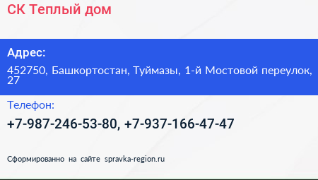 СК Теплый дом по адресу 452750, Башкортостан, Туймазы, 1-й Мостовой переулок, 27 в дальнейшем Организация, размещена в следующих категориях: