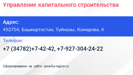 Управление капитального строительства по адресу 452754, Башкортостан, Туймазы, Комарова, 4 в дальнейшем Организация, размещена в следующих категориях: