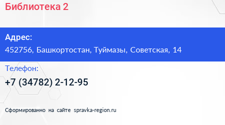 Библиотека №2 по адресу 452756, Башкортостан, Туймазы, Советская, 14 в дальнейшем Организация, размещена в следующих категориях: