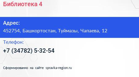 Библиотека №4 по адресу 452754, Башкортостан, Туймазы, Чапаева, 12 в дальнейшем Организация, размещена в следующих категориях: