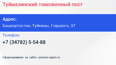 Туймазинский таможенный пост по адресу Башкортостан, Туймазы, Горького, 37 в дальнейшем Организация, размещена в следующих категориях: