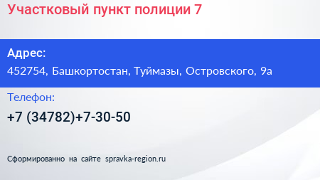 Участковый пункт полиции №7 по адресу 452754, Башкортостан, Туймазы, Островского, 9а в дальнейшем Организация, размещена в следующих категориях: