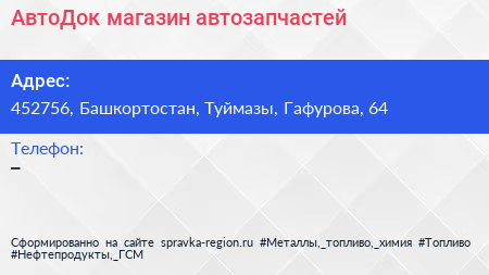 АвтоДок, магазин автозапчастей по адресу 452756, Башкортостан, Туймазы, Гафурова, 64 в дальнейшем Организация, размещена в следующих категориях: