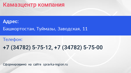 Камазцентр, компания по адресу Башкортостан, Туймазы, Заводская, 11 в дальнейшем Организация, размещена в следующих категориях: