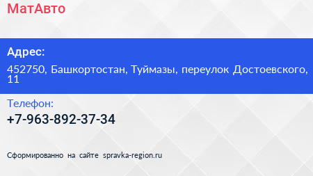 МатАвто по адресу 452750, Башкортостан, Туймазы, переулок Достоевского, 11 в дальнейшем Организация, размещена в следующих категориях: