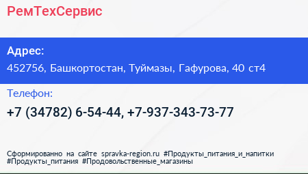 РемТехСервис по адресу 452756, Башкортостан, Туймазы, Гафурова, 40 ст4 в дальнейшем Организация, размещена в следующих категориях:
