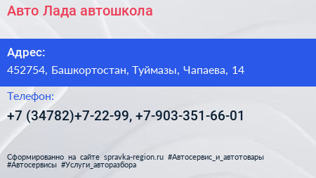 Авто Лада, автошкола по адресу 452754, Башкортостан, Туймазы, Чапаева, 14 в дальнейшем Организация, размещена в следующих категориях: