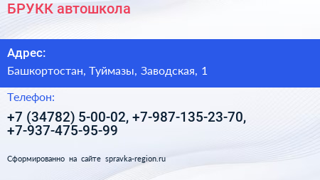 БРУКК, автошкола по адресу Башкортостан, Туймазы, Заводская, 1 в дальнейшем Организация, размещена в следующих категориях: