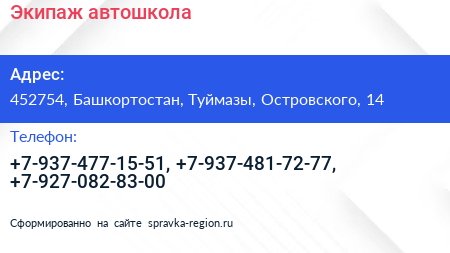 Экипаж, автошкола по адресу 452754, Башкортостан, Туймазы, Островского, 14 в дальнейшем Организация, размещена в следующих категориях: