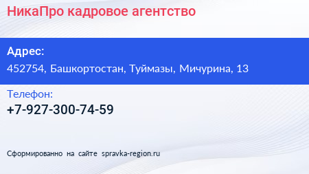 НикаПро, кадровое агентство по адресу 452754, Башкортостан, Туймазы, Мичурина, 13 в дальнейшем Организация, размещена в следующих категориях: