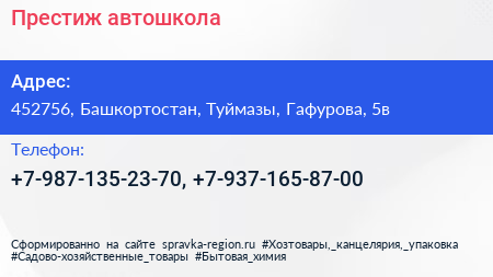Престиж, автошкола по адресу 452756, Башкортостан, Туймазы, Гафурова, 5в в дальнейшем Организация, размещена в следующих категориях:
