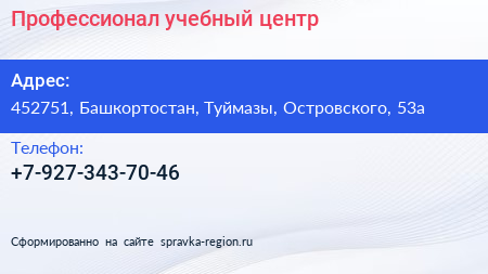 Профессионал, учебный центр по адресу 452751, Башкортостан, Туймазы, Островского, 53а в дальнейшем Организация, размещена в следующих категориях: