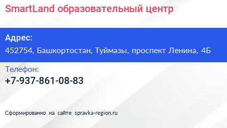 SmartLand, образовательный центр по адресу 452754, Башкортостан, Туймазы, проспект Ленина, 4Б в дальнейшем Организация, размещена в следующих категориях:
