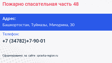 Пожарно-спасательная часть №48 по адресу Башкортостан, Туймазы, Мичурина, 30 в дальнейшем Организация, размещена в следующих категориях: