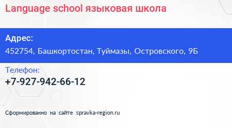 Language school, языковая школа по адресу 452754, Башкортостан, Туймазы, Островского, 9Б в дальнейшем Организация, размещена в следующих категориях:
