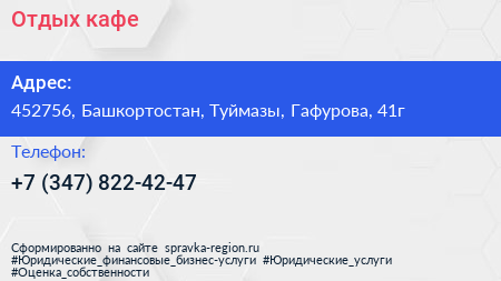 Отдых, кафе по адресу 452756, Башкортостан, Туймазы, Гафурова, 41г в дальнейшем Организация, размещена в следующих категориях:
