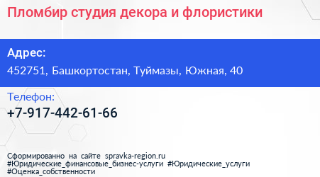 Пломбир, студия декора и флористики по адресу 452751, Башкортостан, Туймазы, Южная, 40 в дальнейшем Организация, размещена в следующих категориях:
