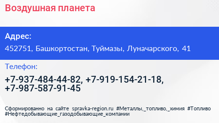 Воздушная планета по адресу 452751, Башкортостан, Туймазы, Луначарского, 41 в дальнейшем Организация, размещена в следующих категориях: