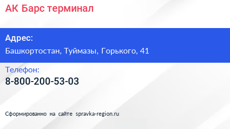 АК Барс, терминал по адресу Башкортостан, Туймазы, Горького, 41 в дальнейшем Организация, размещена в следующих категориях: