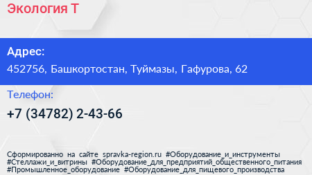 Экология Т по адресу 452756, Башкортостан, Туймазы, Гафурова, 62 в дальнейшем Организация, размещена в следующих категориях: