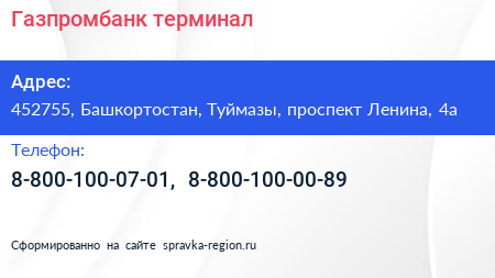 Газпромбанк, терминал по адресу 452755, Башкортостан, Туймазы, проспект Ленина, 4а в дальнейшем Организация, размещена в следующих категориях: