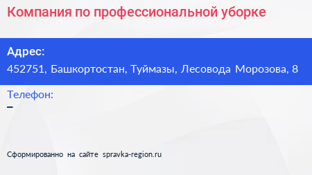 Компания по профессиональной уборке по адресу 452751, Башкортостан, Туймазы, Лесовода Морозова, 8 в дальнейшем Организация, размещена в следующих категориях: