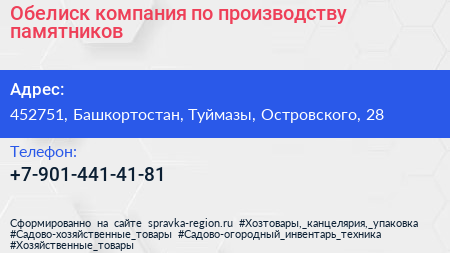 Обелиск, компания по производству памятников по адресу 452751, Башкортостан, Туймазы, Островского, 28 в дальнейшем Организация, размещена в следующих категориях: