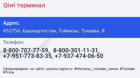Qiwi, терминал по адресу 452756, Башкортостан, Туймазы, Тукаева, 8 в дальнейшем Организация, размещена в следующих категориях: