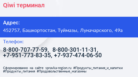 Qiwi, терминал по адресу 452757, Башкортостан, Туймазы, Луначарского, 49а в дальнейшем Организация, размещена в следующих категориях: