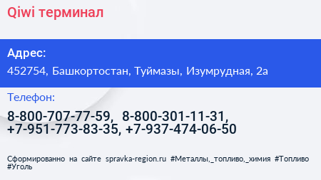 Qiwi, терминал по адресу 452754, Башкортостан, Туймазы, Изумрудная, 2а в дальнейшем Организация, размещена в следующих категориях: