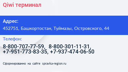 Qiwi, терминал по адресу 452751, Башкортостан, Туймазы, Островского, 44 в дальнейшем Организация, размещена в следующих категориях: