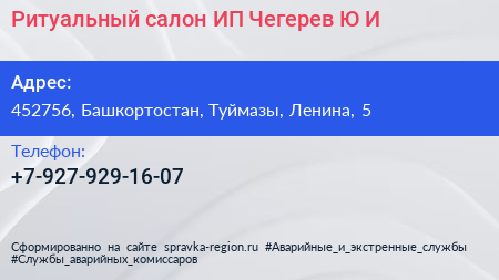 Ритуальный салон, ИП Чегерев Ю.И. по адресу 452756, Башкортостан, Туймазы, Ленина, 5 в дальнейшем Организация, размещена в следующих категориях: