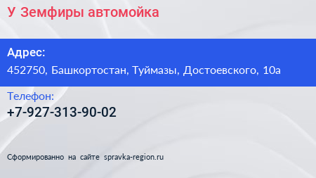 У Земфиры, автомойка по адресу 452750, Башкортостан, Туймазы, Достоевского, 10а в дальнейшем Организация, размещена в следующих категориях: