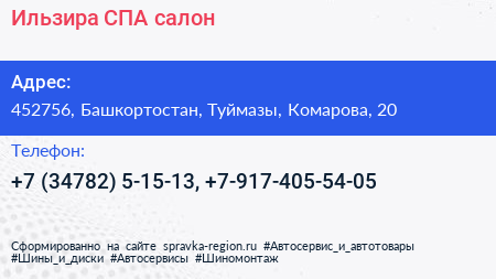 Ильзира, СПА-салон по адресу 452756, Башкортостан, Туймазы, Комарова, 20 в дальнейшем Организация, размещена в следующих категориях: