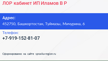 ЛОР-кабинет, ИП Иламов В.Р. по адресу 452750, Башкортостан, Туймазы, Мичурина, 6 в дальнейшем Организация, размещена в следующих категориях: