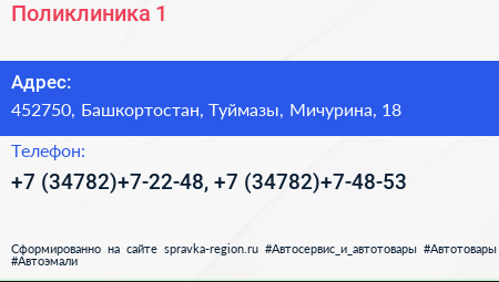 Поликлиника №1 по адресу 452750, Башкортостан, Туймазы, Мичурина, 18 в дальнейшем Организация, размещена в следующих категориях: