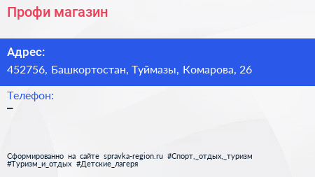 Профи, магазин по адресу 452756, Башкортостан, Туймазы, Комарова, 26 в дальнейшем Организация, размещена в следующих категориях: