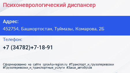 Психоневрологический диспансер по адресу 452754, Башкортостан, Туймазы, Комарова, 2Б в дальнейшем Организация, размещена в следующих категориях: