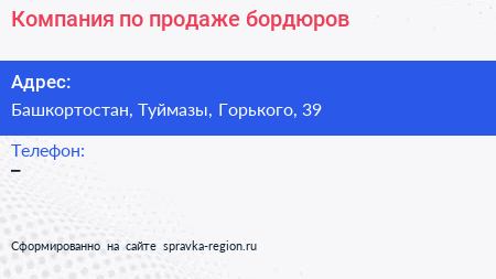 Компания по продаже бордюров по адресу Башкортостан, Туймазы, Горького, 39 в дальнейшем Организация, размещена в следующих категориях: