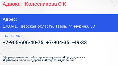 Адвокат Колесникова О.К. по адресу 170041, Тверская область, Тверь, Мичурина, 39 в дальнейшем Организация, размещена в следующих категориях: