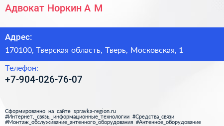 Адвокат Норкин А.М. по адресу 170100, Тверская область, Тверь, Московская, 1 в дальнейшем Организация, размещена в следующих категориях: