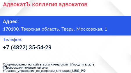 АдвокатЪ, коллегия адвокатов по адресу 170100, Тверская область, Тверь, Московская, 1 в дальнейшем Организация, размещена в следующих категориях:
