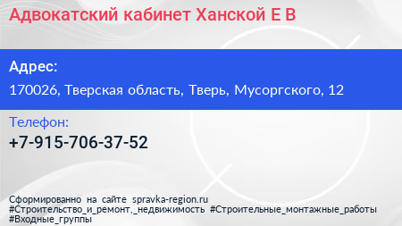 Адвокатский кабинет Ханской Е.В. по адресу 170026, Тверская область, Тверь, Мусоргского, 12 в дальнейшем Организация, размещена в следующих категориях: