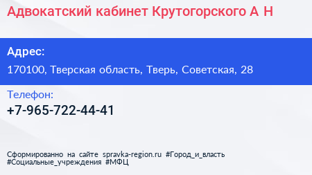Адвокатский кабинет Крутогорского А.Н. по адресу 170100, Тверская область, Тверь, Советская, 28 в дальнейшем Организация, размещена в следующих категориях: