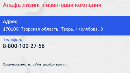 Альфа-лизинг, лизинговая компания по адресу 170100, Тверская область, Тверь, Желябова, 3 в дальнейшем Организация, размещена в следующих категориях: